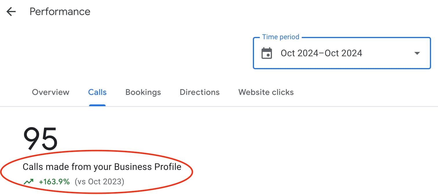 Google Business Profile engagement and impressions were also up substantially year-over-year. That means in less than 1 year he was getting better performance than years of “SEO” with his previous rented website.