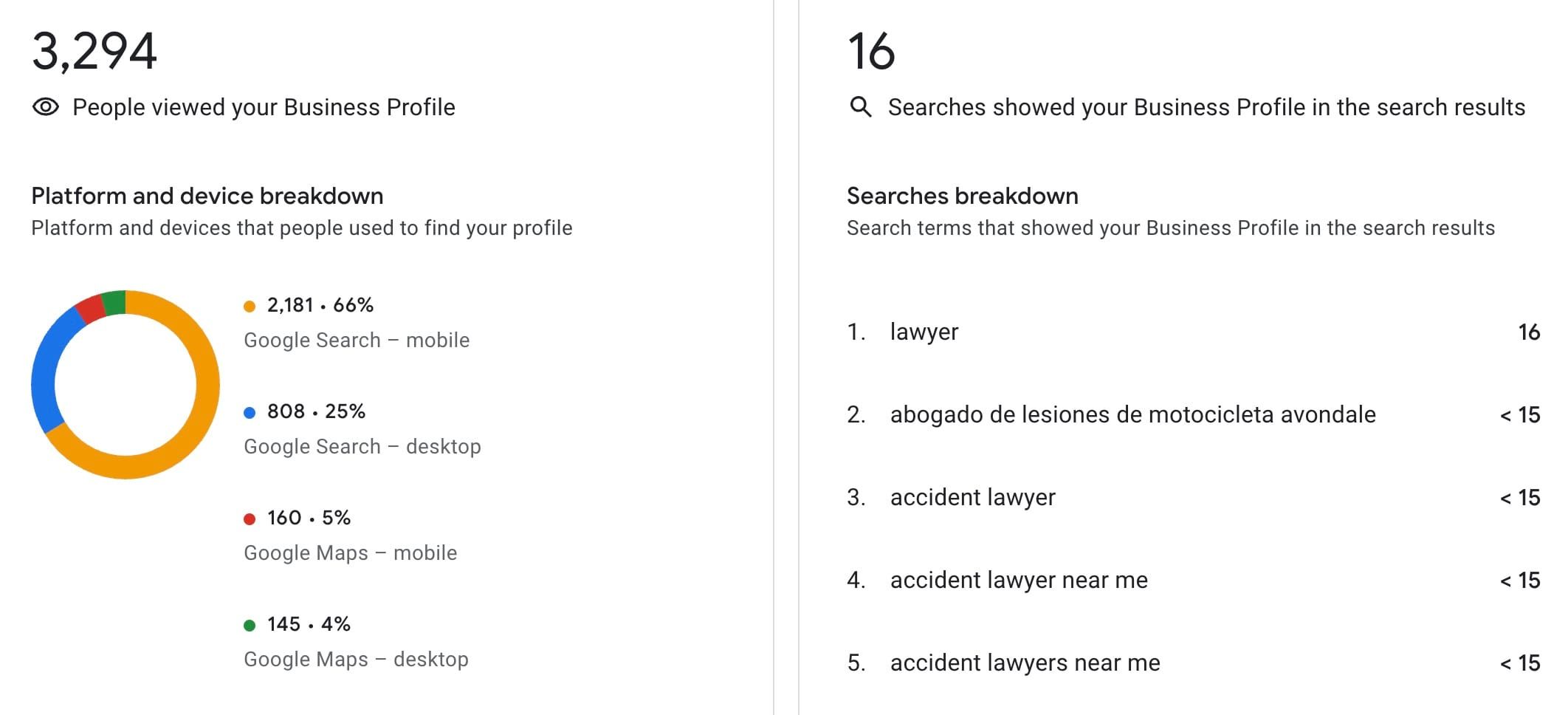 Starting from exactly zero visibility with a brand new GBP, the client had over 80% share of local voice (the percentage of how often their business was in Google’s Map Pack) for many geo-specific keywords with the city name. The client also received 12 qualified leads and did secure clients just in the first 90 days from SEO – a notable metric when starting from scratch in the extremely competitive injury law niche, if you ask us!